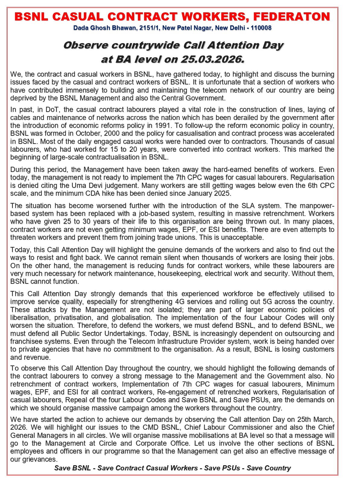 As decided in the Delhi National Convention of BSNLCCWF, a countrywide Call Attention Day will be observed on 25th March, 2026 to highlight the Charter of Demands adopted in the Convention. The Convention has emphasised key issues concerning contract and casual labourers, including prevention of retrenchment, implement...
